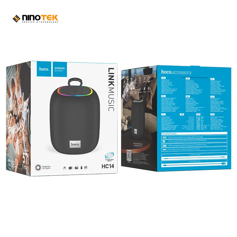 Bên cạnh đó, toàn bộ phần thân của loa Bluetooth Hoco HC14 được gia công bằng nhựa chất lượng cao. Thiết kế với các góc loa được bo tròn mềm mại, tăng tính thẩm mỹ và cảm giác dễ chịu khi cầm nắm. Trên thân loa còn được trang bị thêm một vòng đèn LED RGB với nhiều chế độ phát sáng khác nhau. Đèn được trang bị cũng có thể tùy chỉnh điều khiển bật/tắt theo ý của người dùng. Ngoài ra, loa có tới 2 phiên bản màu sắc để người dùng có thể lựa chọn: màu đen và màu xanh lá.